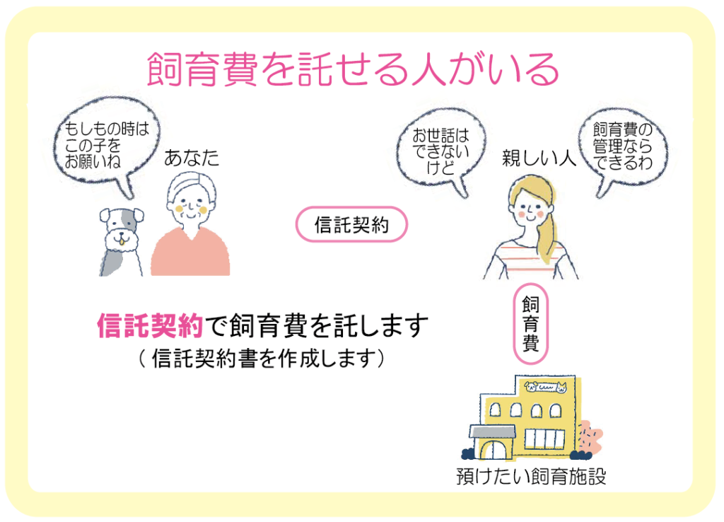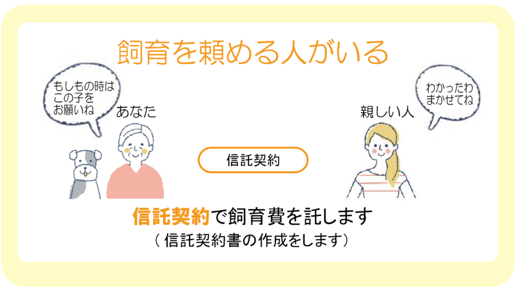 身近にペットと飼育費を託せる方がいる場合、(1)ペットを飼育してもらうこと(2)そのための飼育費の2つを託せる方とお元気なうちに契約して、「小さな命の将来」に備えます